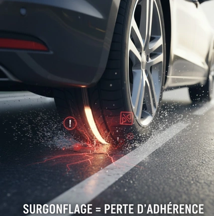 Des pneus sous-gonflés augmentent la distance de freinage, la consommation de carburant et risquent la surchauffe. Des pneus surgonflés diminuent l’adhérence et provoquent une usure rapide au centre. Les deux cas réduisent la sécurité globale du véhicule.